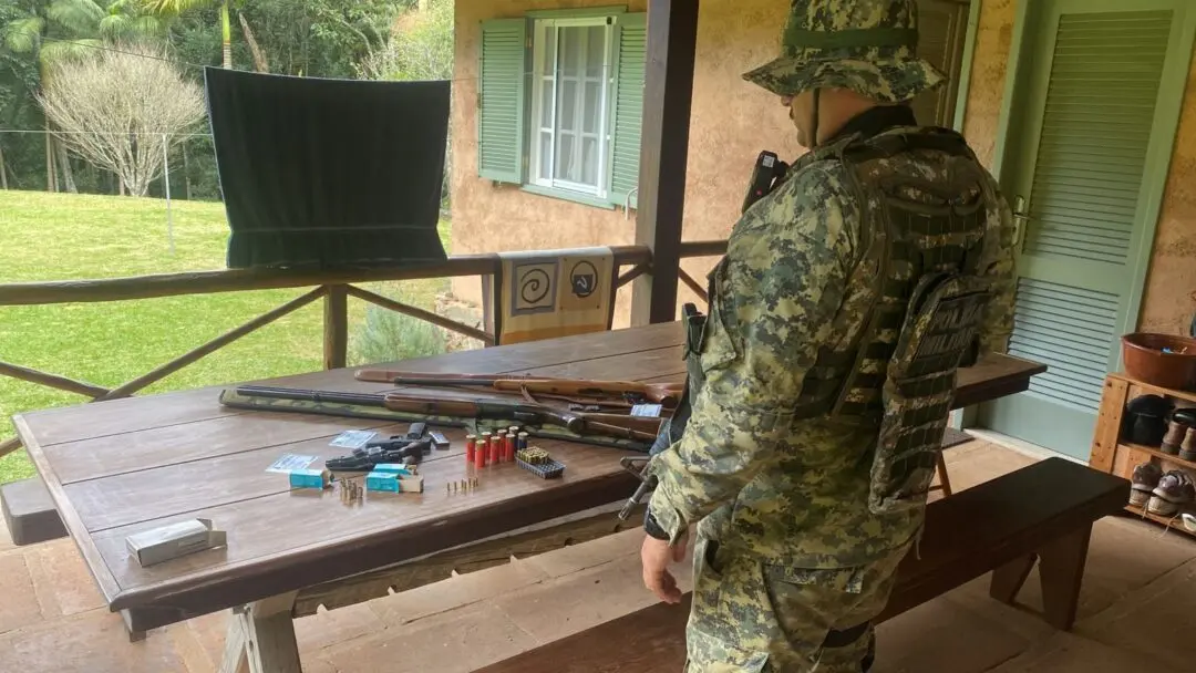 Durante a fiscalização no local, encontraram uma espingarda calibre 22, uma espingarda calibre 12, um revólver calibre 32, uma pistola calibre 7.65, um simulacro de arma de fogo, 27 munições calibre 32, 10 munições calibre 22 e oito munições calibre 12.