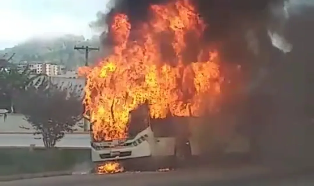 Um ônibus da Auto Viação 1001 pegou fogo na manhã de hoje no distrito de Conselheiro Paulino, quando chegava de viagem do município de Bom Jardim.