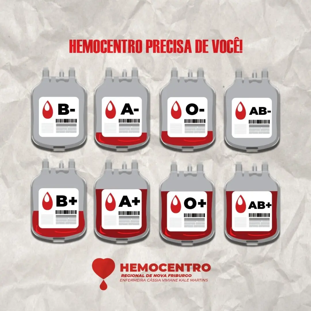 O Hemocentro Regional de Nova Friburgo, em nota, pede a colaboração dos friburguenses na doação sanguínea e reposição de estoque que se mostra escasso para alguns tipos. B-,