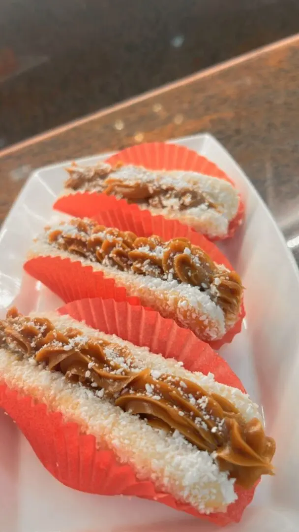 - Passe uma camada de doce de leite em um dos biscoitos e una a outro