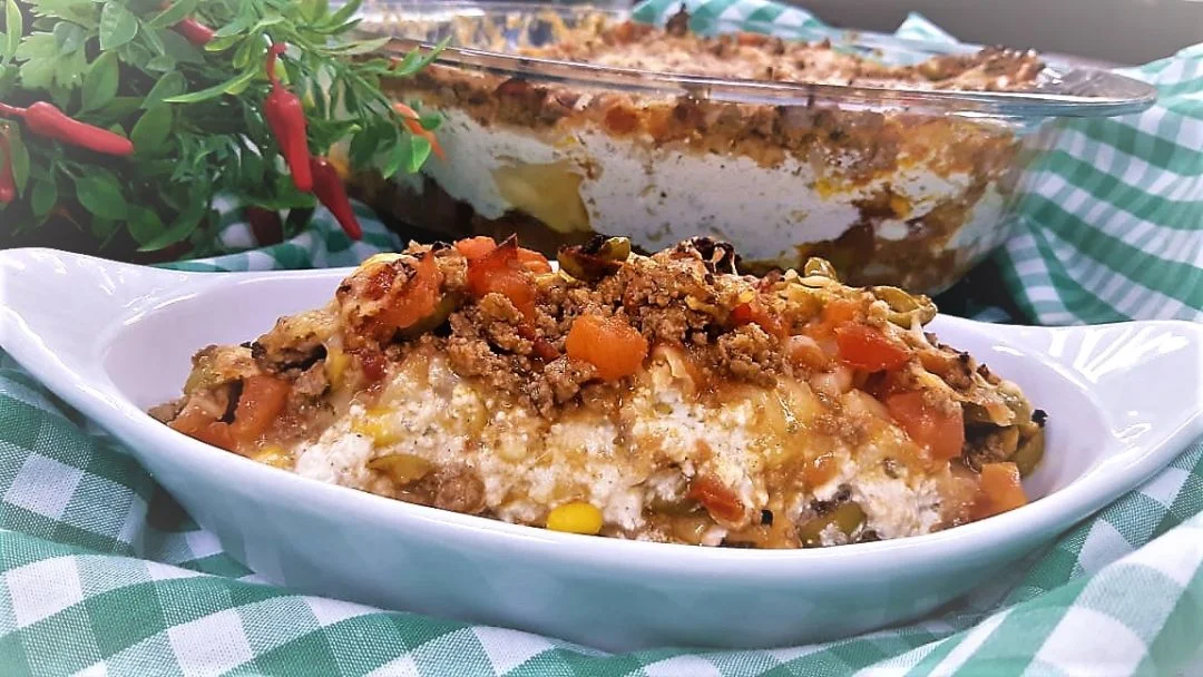 3. Com o auxílio de uma concha, coloque o molho de carne moída e logo após, cubra novamente com a massa.
