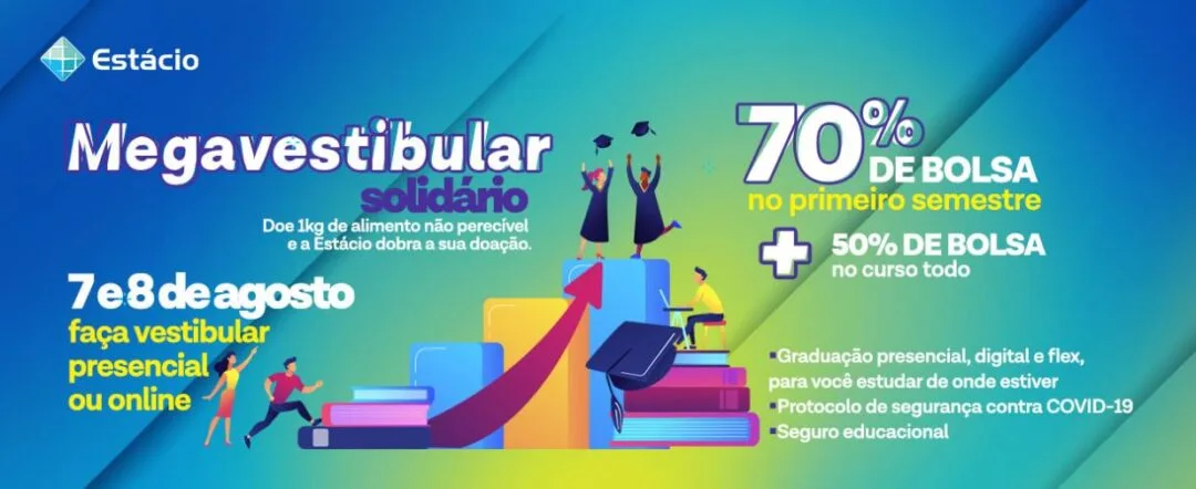 Nos dias 7 e 8 de agosto, próxima sexta e sábado, irá acontecer o Mega Vestibular Solidário da Estácio, online e presencialmente. A faculdade disponibilizará 70% de bolsa no primeiro semestre e 50% durante todo o curso.
