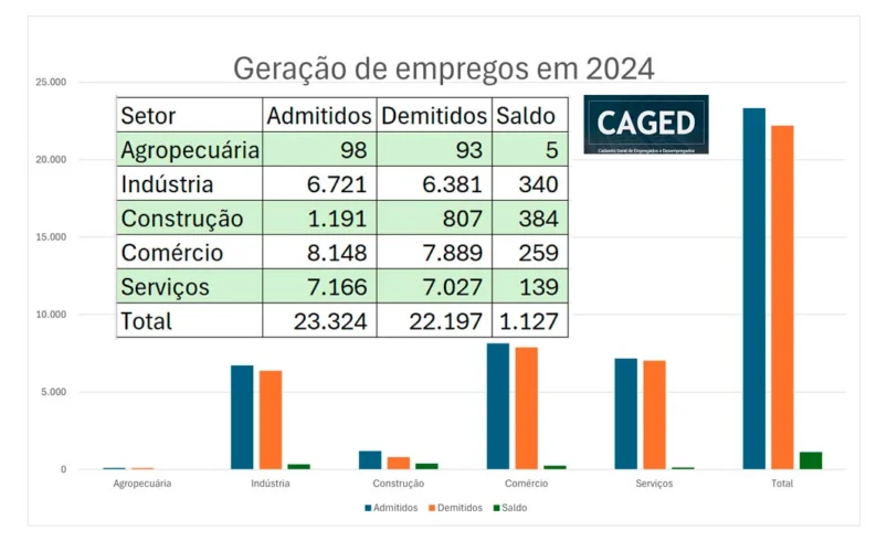 No setor de Serviços, o saldo foi de 139 postos de trabalho, enquanto a Agropecuária registrou crescimento mínimo, com apenas cinco novas vagas.