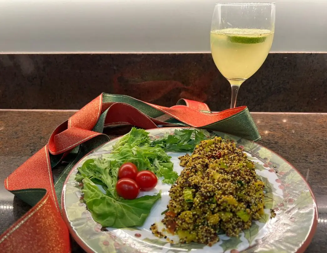 Ingredientes: 300g de quinoa 60g de tâmara 200g de abobrinha cortada em cubos 100g de tomate 20g de salsinha 5 ml de azeite tempero a gosto Modo de preparo: Coloque a quinoa na água fria. Após ferver, cozinhe por 10 minutos no fogo, escorra e reserve. Na panela, frite a abobrinha no azeite e temperos e refogue o tomate e salsinha, junte a quinoa, a tâmara e o sal. TV ZoomCompartilhe: