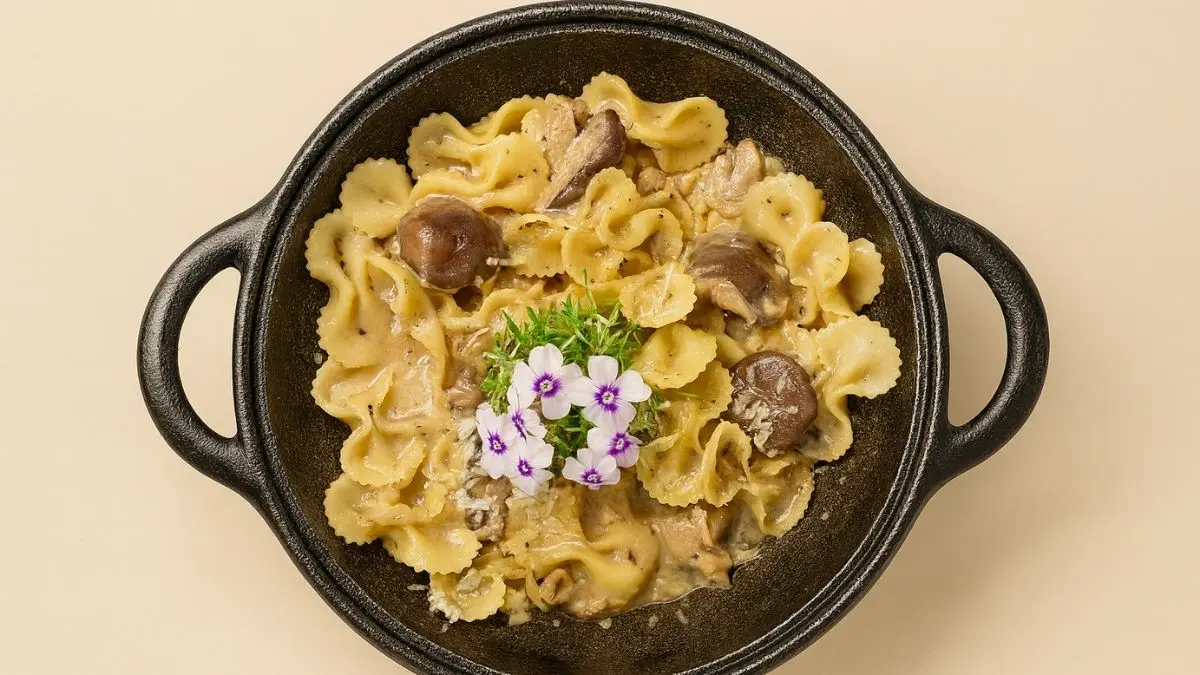Farfalle com shiitake e alho negro finalizado com azeite trufado