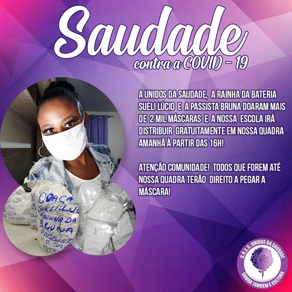 A escola de samba Unidos da Saudade anunciou, na noite de ontem, 21, que, em parceria sua rainha de bateria, Sueli Lúcio, e a passista Bruna, vai realizar uma doação de máscaras para sua comunidade.