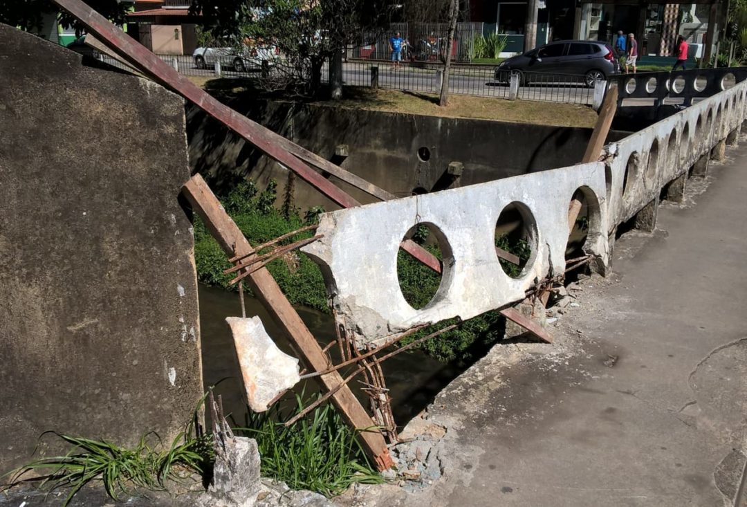 A ponte que sai da Avenida Euterpe Friburguense em direção a Rodovia Presidente João Goulart está com sua mureta de proteção danificada. No início da ponte, vergalhões enferrujados estão expostos, podendo ferir